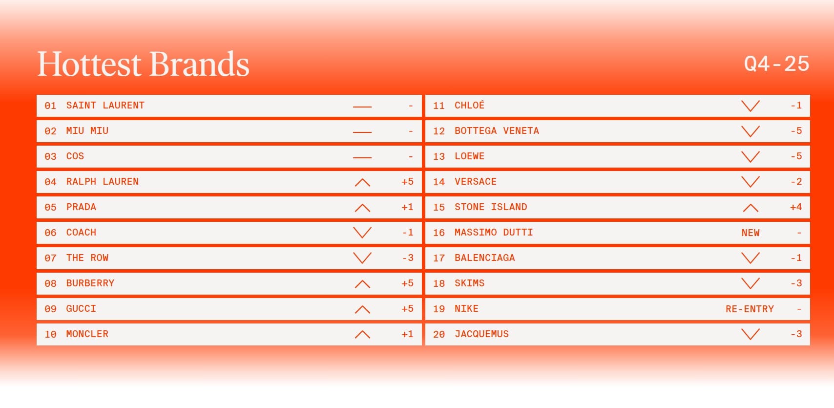 E' uscita questa mattina la classifica trimestrale di Lyst, quella relativa all'ultimo trimestre del 2025. Pur avendo una validità molto parziale, è comunque un punto di vista autorevole sull'andamento dei marchi sul mercato. Un andamento che viene ricavato dal comportamento dei consumatori, piuttosto che dall'andamento della borsa o dalla pressione dei media. Lyst, infatti, è una piattaforma di vendita on line cui ogni anno accedono più di 160 milioni di consumatori. E la classifica viene stilata tenendo conto "del comportamento degli acquirenti di Lyst, incluse le ricerche sulla piattaforma e al di fuori di essa, le visualizzazioni dei prodotti e le vendite. Per monitorare l'interesse per marchi e prodotti, la formula incorpora anche le menzioni sui social media, le attività e le statistiche di engagement a livello mondiale".